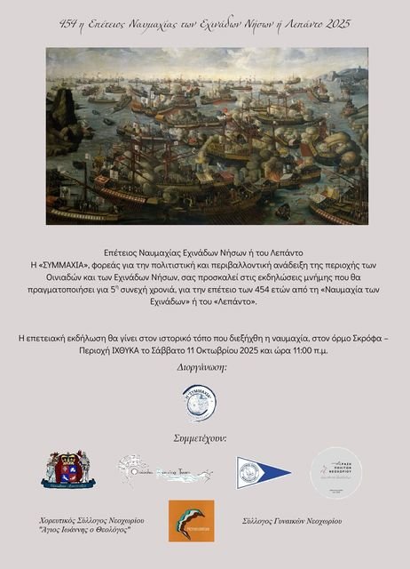 Με επίκεντρο τον όρμο Σκρόφα, στον ιστορικό τόπο όπου γράφτηκε μία από τις μεγαλύτερες ναυμαχίες της παγκόσμιας ιστορίας, θα πραγματοποιηθούν το Σάββατο 11 Οκτωβρίου 2025, οι εκδηλώσεις για την 454η επέτειο της Ναυμαχίας των Εχινάδων νήσων, γνωστής και ως Λεπάντο. Τη διοργάνωση έχει αναλάβει ο πολιτιστικός φορέας «ΣΥΜΜΑΧΙΑ», που εδώ και χρόνια δραστηριοποιείται στην πολιτιστική και περιβαλλοντική ανάδειξη της περιοχής των Οινιαδών και των Εχινάδων. Πρόκειται για την 5η συνεχόμενη χρονιά που οργανώνονται οι συγκεκριμένες εκδηλώσεις μνήμης, με σκοπό να τιμηθούν οι πεσόντες και να αναδειχθεί ο ιστορικός χαρακτήρας της μάχης, η οποία άλλαξε τον ρου της Ιστορίας.