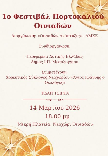 Η προσπάθεια αυτή συνεχίζεται σήμερα μέσα από μια νέα πρωτοβουλία, την οποία σχεδίασε και υλοποιεί η «Οινιαδών Ανάπτυξις» – ΑΜΚΕ, με στόχο να αναδειχθεί ακόμη περισσότερο η σημασία της καλλιέργειας των εσπεριδοειδών για τον τόπο αλλά και να συνδεθεί η παραγωγή με την οικονομία, την κοινωνική ζωή και τον πολιτισμό της περιοχής, μέσα από τη διοργάνωση του «1ου Φεστιβάλ Πορτοκαλιού Οινιαδών», μιας εκδήλωσης που πραγματοποιείται με την υποστήριξη της Περιφέρειας Δυτικής Ελλάδας και του Δήμου Ιερής Πόλης Μεσολογγίου και η οποία θα λάβει χώρα το Σάββατο 14 Μαρτίου 2026, στις 6:00 μ.μ., στη Μικρή Πλατεία του Νεοχωρίου Οινιαδών.