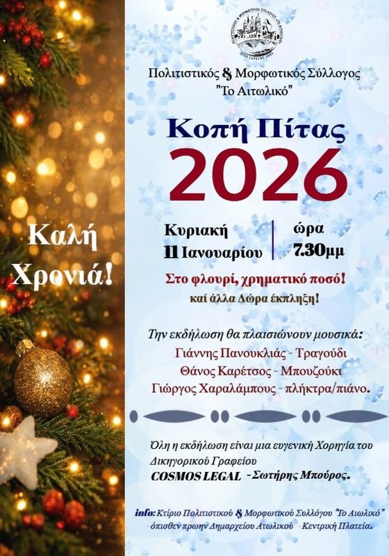 Σε γιορτινούς ρυθμούς μπαίνει το Αιτωλικό την Κυριακή 11 Ιανουαρίου, καθώς ο Πολιτιστικός και Μορφωτικός Σύλλογος «Το Αιτωλικό» δίνει ραντεβού με τα μέλη και τους φίλους του για την καθιερωμένη κοπή της βασιλόπιτας για το 2026. «Κόβουμε την πίτα μας για το 2026 και γιορτάζουμε μαζί!». Με αυτό το σύνθημα, ο Σύλλογος ανοίγει την αυλαία μιας βραδιάς που, όπως λένε οι άνθρωποί του, δεν θα έχει μόνο το φλουρί της τύχης, αλλά και όλα εκείνα τα «υλικά» που κρατούν ζωντανή την κοινότητα: κέφι, μεράκι και καλή παρέα.
