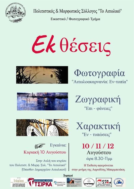 Η ζωγραφική έκθεση με τίτλο «Επί-φάνειες», η έκθεση χαρακτικής με τίτλο «Εν-τυπώσεις», και η φωτογραφική έκθεση με τίτλο «Αιτωλοακαρνανία: Εν-τοπία» συγκροτούν το εικαστικό τριήμερο του Συλλόγου, με ώρες λειτουργίας από τις 8:00 έως τις 11:00 το βράδυ. Η είσοδος είναι ελεύθερη για το κοινό.