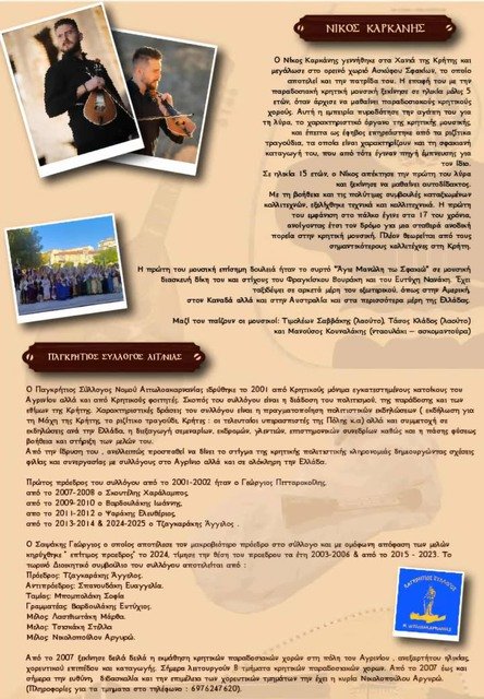 Ο Νίκος Καρκάνης, μαζί με το συγκρότημά του από τα Σφακιά, θα αναλάβουν να κρατήσουν ζωντανό το κλίμα της γιορτής μέχρι αργά, προσφέροντας ένα πλήρες μουσικό πρόγραμμα. Η εκδήλωση αποτελεί πλέον θεσμό για την τοπική κοινότητα, συγκεντρώνοντας κάθε χρόνο δεκάδες φίλους της κρητικής μουσικής αλλά και όσους αναζητούν μια αυθεντική γλεντιστερή εμπειρία