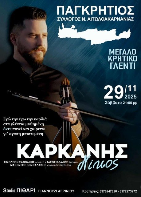 Για ακόμη μία χρονιά, ο Παγκρήτιος Σύλλογος Νομού Αιτωλοακαρνανίας δίνει το στίγμα του στο Αγρίνιο, διοργανώνοντας το καθιερωμένο ετήσιο κρητικό γλέντι του. Το ραντεβού έχει οριστεί για το Σάββατο 29 Νοεμβρίου 2025, σε μια βραδιά που αναμένεται να γεμίσει με ήχους λύρας, ριζίτικα και τον παλμό της κρητικής παράδοσης.
