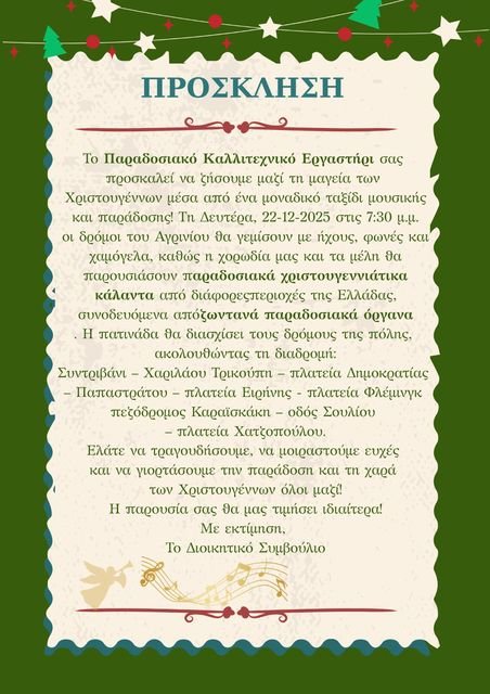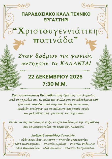 Με τη μουσική της παράδοσης και το πνεύμα των Χριστουγέννων να πρωταγωνιστούν, το Παραδοσιακό Καλλιτεχνικό Εργαστήρι Αγρινίου προσκαλεί το κοινό σε δύο ξεχωριστές γιορτινές δράσεις, την Κυριακή 21 και τη Δευτέρα 22 Δεκεμβρίου 2025. Δύο ημέρες αφιερωμένες στο τραγούδι, τα κάλαντα και τη συλλογική εμπειρία που ενώνει μικρούς και μεγάλους.