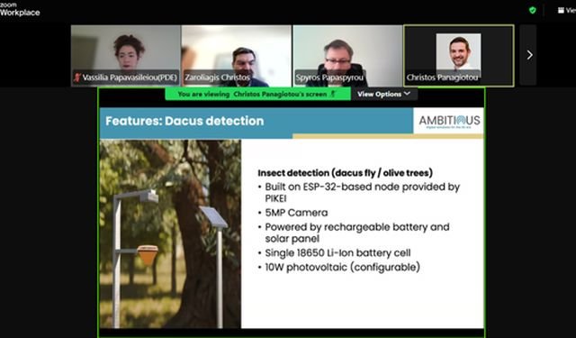 Στο πλαίσιο του ευρωπαϊκού έργου Ambitious, στο οποίο συμμετέχει ως εταίρος η Περιφέρεια Δυτικής Ελλάδας μέσω της Διεύθυνσης Αγροτικής Οικονομίας, πραγματοποιήθηκε την Τετάρτη 18 Φεβρουαρίου 2026 διαδικτυακή συνάντηση με τη συμμετοχή όλων των εμπλεκόμενων φορέων, κατά τη διάρκεια της οποίας παρουσιάστηκε αναλυτικά το πιλοτικό σύστημα αναγνώρισης του Δάκου, δηλαδή του εντόμου που προσβάλλει τις ελαιοκαλλιέργειες και προκαλεί σημαντικές απώλειες στην παραγωγή, ενώ παράλληλα έγινε εκτενής ενημέρωση για το λογισμικό που αναπτύσσεται και για την εγκατάσταση που υποστηρίζει τη λειτουργία του εργαλείου, ώστε οι συμμετέχοντες να αποκτήσουν πλήρη εικόνα τόσο για τον τρόπο με τον οποίο λειτουργεί το σύστημα όσο και για τα μέχρι στιγμής αποτελέσματα που έχουν προκύψει από την πιλοτική εφαρμογή του, καθώς και για τις τεχνικές παραμέτρους που καθορίζουν την αξιοποίησή του στο πεδίο.