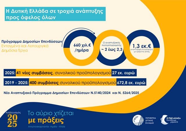 Το 2025, όπως το περιέγραψε ο Περιφερειάρχης Δυτικής Ελλάδας Νεκτάριος Φαρμάκης κατά την ειδική συνεδρίαση λογοδοσίας του Περιφερειακού Συμβουλίου στις 11 Φεβρουαρίου 2026, αποτέλεσε τη χρονιά κατά την οποία η Δυτική Ελλάδα, έχοντας αφήσει πίσω της μια μακρά περίοδο εσωστρέφειας και αμυντικών αντανακλαστικών, πέρασε σε ένα νέο επίπεδο διεκδίκησης, εξωστρέφειας και αποτελέσματος, καθώς – όπως υπογράμμισε – δεν αρκείται πλέον στο να ακολουθεί τις εξελίξεις αλλά επιδιώκει να βρίσκεται στον πυρήνα τους, διεκδικώντας πρωτιές και συμμετέχοντας ενεργά σε κάθε σοβαρή συζήτηση που αφορά το μέλλον του τόπου και της ίδιας της Αυτοδιοίκησης, με την πεποίθηση ότι πρόκειται για μια περιφέρεια χωρίς «ταβάνι», η οποία μπορεί να μετατρέψει τις δυνατότητές της σε απτό αναπτυξιακό αποτύπωμα.