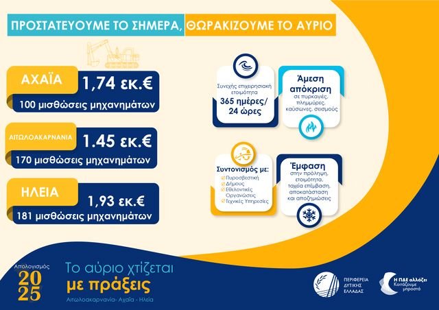 Την ίδια στιγμή, καθώς η Περιφέρεια βρέθηκε αντιμέτωπη με πυρκαγιές και πλημμυρικά φαινόμενα, επένδυσε σε σχέδιο προσαρμογής στην κλιματική αλλαγή, σε ανανέωση στόλου μηχανημάτων και σε σύγχρονα τεχνολογικά μέσα πολιτικής προστασίας, μεταξύ των οποίων νέο κέντρο επιτήρησης κινδύνου πυρκαγιάς που βρίσκεται ήδη σε δοκιμαστική λειτουργία, επισημαίνοντας ωστόσο ότι απαιτείται περαιτέρω ενίσχυση της ανθεκτικότητας και ουσιαστική στήριξη από το κράτος με εξειδικευμένο προσωπικό και εξοπλισμό, ενώ στον τομέα της δημόσιας υγείας και της κοινωνικής συνοχής η λειτουργία δομών φροντίδας, η ενεργειακή αναβάθμιση νοσοκομείων και η προμήθεια ιατρομηχανολογικού εξοπλισμού καταδεικνύουν μια στρατηγική που επιχειρεί να συνδυάσει ανάπτυξη με κοινωνική μέριμνα .