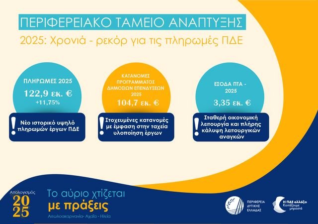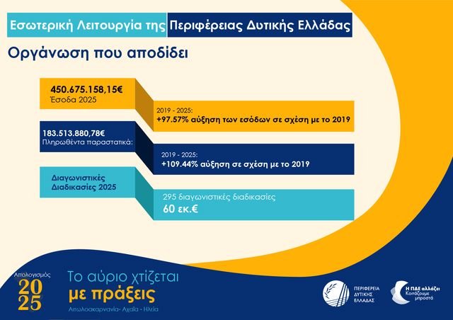 Σε απόλυτους αριθμούς, ο απολογισμός του 2025 περιλαμβάνει 952 έργα με συνολικό πρόγραμμα 1,5 δισ. ευρώ, ενώ οι πληρωμές ξεπέρασαν τα 200 εκατ. ευρώ, διοχετεύοντας στην τοπική οικονομία περίπου 660.000 ευρώ ημερησίως – ποσό που, με τον αναπτυξιακό πολλαπλασιαστή, προσεγγίζει το 1,3 εκατ. ευρώ – την ίδια στιγμή που τα συνολικά έσοδα υπερέβησαν τα 450 εκατ. ευρώ παρουσιάζοντας σχεδόν διπλασιασμό σε σχέση με το 2019, ενώ οι πληρωμές άγγιξαν τα 183 εκατ. ευρώ και το Περιφερειακό Ταμείο Ανάπτυξης κατέγραψε σχεδόν τριπλασιασμό πληρωμών, γεγονός που αποτυπώνει τη διεύρυνση της δημοσιονομικής και διαχειριστικής δυνατότητας της Περιφέρειας.