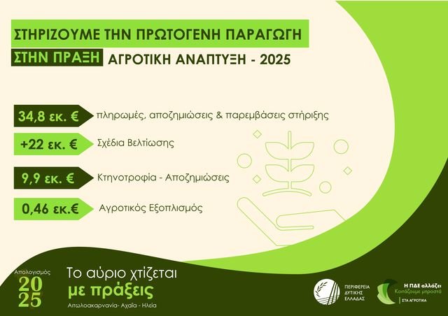 Στον τομέα της επιχειρηματικότητας, όπου υλοποιούνται 113 επενδυτικά σχέδια μεταποίησης συνολικού ύψους 28,8 εκατ. ευρώ, ενισχύονται πολύ μικρές και μικρές επιχειρήσεις με 23 εκατ. ευρώ, ενώ ο ψηφιακός μετασχηματισμός μέσω του DigiWest χρηματοδοτείται με 4 εκατ. ευρώ, διαμορφώνεται ένα πλέγμα παρεμβάσεων που αποσκοπεί στη μετάβαση της τοπικής οικονομίας σε πιο ανταγωνιστικά και ανθεκτικά πρότυπα, την ώρα που στον αγροτικό τομέα διατίθενται 35 εκατ. ευρώ για δράσεις στήριξης και 22 εκατ. ευρώ για Σχέδια Βελτίωσης, ενώ έχουν υποβληθεί προτάσεις 120 εκατ. ευρώ για έργα άρδευσης και αντιμετώπισης της λειψυδρίας καθώς και τεκμηριωμένες προτάσεις αποζημιώσεων ύψους 150 εκατ. ευρώ για βασικές καλλιέργειες, γεγονός που αναδεικνύει τη βαρύτητα που αποδίδεται στην πρωτογενή παραγωγή.