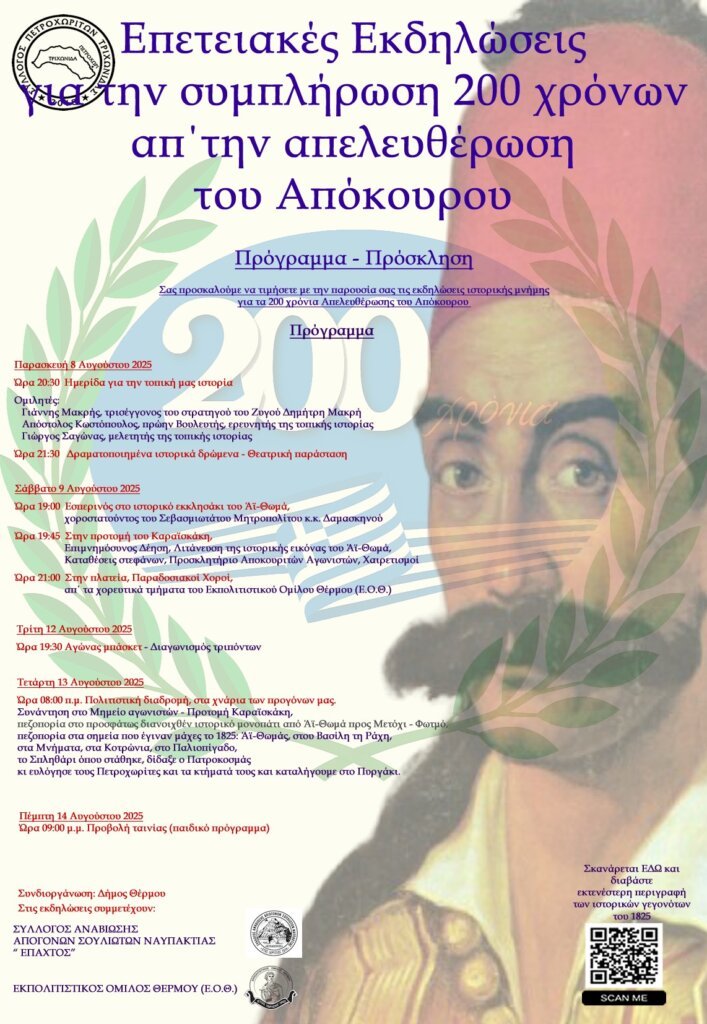 Ο Σύλλογος Πετροχωριτών Τριχωνίδας, επ΄ευκαιρία της συμπλήρωσης 200 χρόνων από την Απελευθέρωση του Αποκούρου, συνδιοργανώνει με τον Δήμο Θέρμου, πολιτιστικές Επετειακές εκδηλώσεις, στο Πετροχώρι ως εξής: