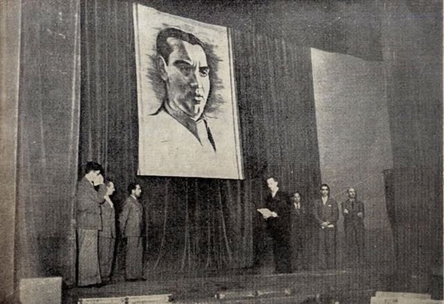 »Και τώρα ή σειρά μας. Τό πορτραίτο του Λόρκα κατεβαίνει άργά τό θόλο τής σκηνής, άπ’ όπου μάς κοίταζε μέ τά πυκνά του φρύδια πέντε μέρες τώρα. Μόλις αρχίζει τήν απαγγελία τού όρκου ό ’Αραγκόν με καμπανιστή φωνή, ένα ρΐγος στήν αίθουσα κ’ υστέρα μια ιερή σιωπή. Κι όταν ένα – ένα πέφτουνε τά μεγάλο: ονόματα τής παγκόσμιας ποίησης, τό θέατρο σειέται όλόκληρο άπό άλλαλαγμους και χειροκροτήματα.