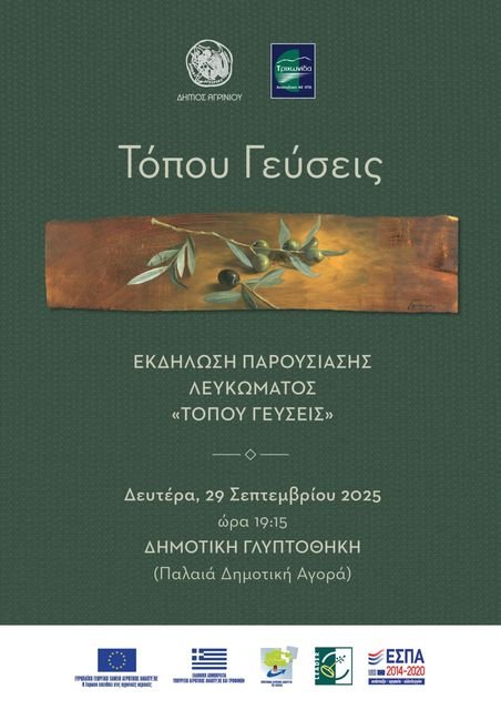 Ο Δήμος Αγρινίου και η Αναπτυξιακή Εταιρεία Τριχωνίδα Α.Ε. συνδιοργανώνουν μια ξεχωριστή εκδήλωση με άρωμα και γεύση από τον τόπο. Τη Δευτέρα 29 Σεπτεμβρίου 2025, στη Δημοτική Γλυπτοθήκη της Παλαιάς Δημοτικής Αγοράς, θα παρουσιαστεί η θεματική έκδοση «Τόπου Γεύσεις», μια δουλειά που αναδεικνύει τα τοπικά προϊόντα και τη γαστρονομική παράδοση της περιοχής.
