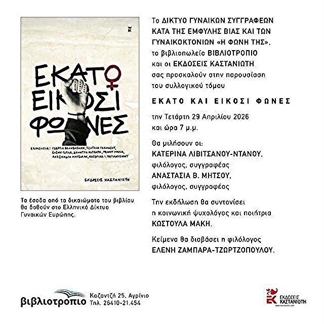 Μια δημόσια συζήτηση με σαφές κοινωνικό αποτύπωμα φιλοξενείται στο Αγρίνιο, με αφορμή την παρουσίαση του συλλογικού τόμου «Εκατό και Είκοσι Φωνές», ενός βιβλίου που συγκεντρώνει ποιήματα και σύντομα πεζά 120 γυναικών συγγραφέων. Το εγχείρημα αποτελεί μια συντονισμένη λογοτεχνική παρέμβαση απέναντι στις γυναικοκτονίες και την έμφυλη βία, επιχειρώντας να μετατρέψει την προσωπική γραφή σε δημόσιο λόγο και κοινωνική στάση.