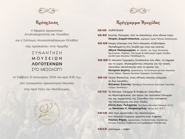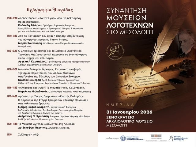 Η Εφορεία Αρχαιοτήτων Αιτωλοακαρνανίας και Λευκάδος, μαζί με τον Σύλλογο Μουσειοπαιδαγωγών Ελλάδος, μας προσκαλούν σε μια ξεχωριστή ημερίδα με τίτλο «Συνάντηση Μουσείων Λογοτεχνών στο Μεσολόγγι». Η ημερίδα θα πραγματοποιηθεί το Σάββατο 31 Ιανουαρίου 2026, στις 9:30 π.μ., στο Ξενοκράτειο Αρχαιολογικό Μουσείο, στην Ιερή Πόλη του Μεσολογγίου, με ελεύθερη είσοδο για το κοινό. Η εκδήλωση εντάσσεται στο πλαίσιο του εορτασμού των 200 χρόνων από την Έξοδο του Μεσολογγίου και τιμά τη βαθιά και διαχρονική λογοτεχνική παράδοση της πόλης. Μια παράδοση που ανέδειξε μεγάλες ποιητικές μορφές και που συνδέθηκε ανεξίτηλα με τον Λόρδο Βύρωνα και τον φιλελληνισμό.
